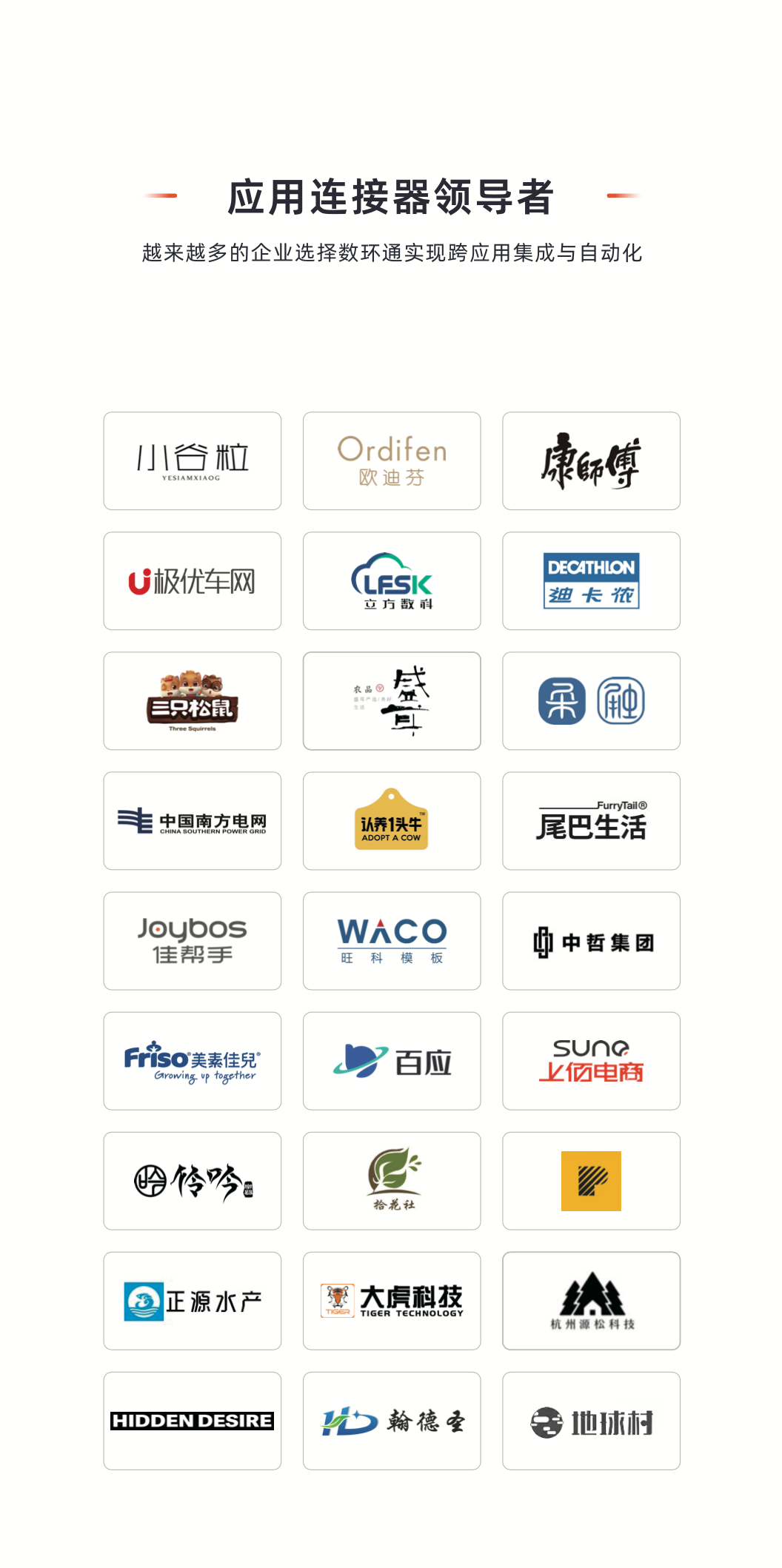 中國南方電網、上佰電商、拾花社、蘇泊爾、盛耳食品、佳幫手等數千家企業已選擇數環通助力企業數字化經營。