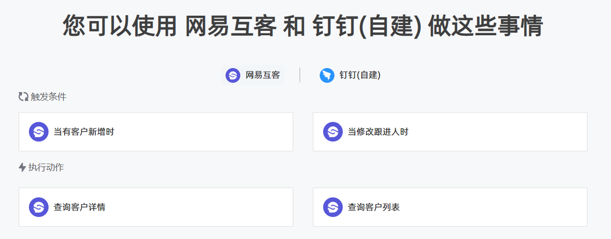 - 根據提示選擇觸發和執行應用:網易互客和釘釘,選擇操作,添加賬號最后完成配置