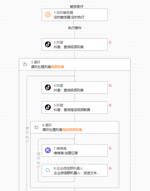 執(zhí)行動作:抖音(查詢視頻列表)— 抖音(查詢指定視頻數(shù)據(jù))— 維格表(創(chuàng)建數(shù)據(jù))— 企業(yè)微信群機(jī)器人(發(fā)送文本信息)