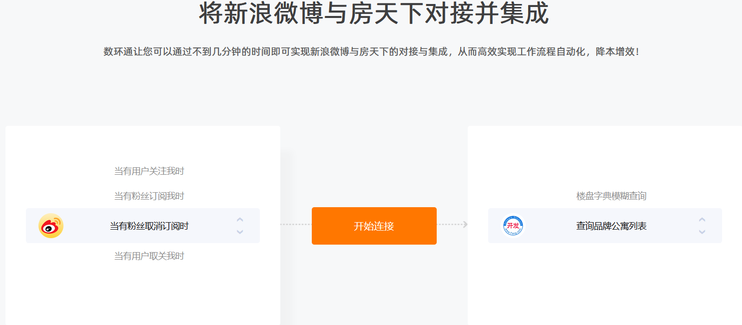 通過(guò)數(shù)環(huán)通,您可以使用不到幾分鐘的時(shí)間即可實(shí)現(xiàn)房天下與抖音的集成與對(duì)接,從而高效實(shí)現(xiàn)工作流程自動(dòng)化,降本增效!