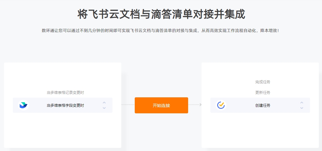 通過數(shù)環(huán)通,您可以使用不到幾分鐘的時間即可實現(xiàn)維格表與滴答清單的對接與集成,從而高效實現(xiàn)工作流程自動化,降本增效!