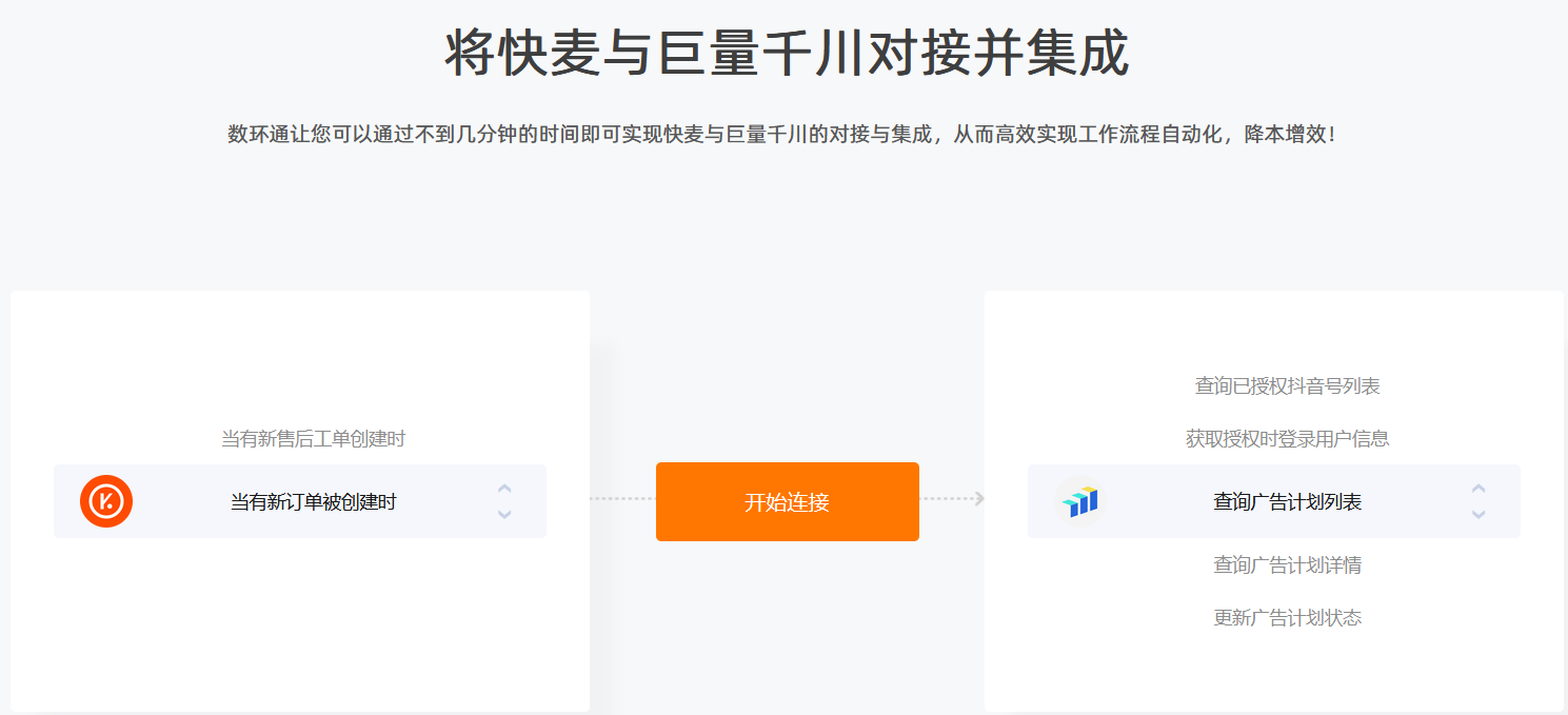 通過數(shù)環(huán)通,您可以使用不到幾分鐘的時(shí)間即可實(shí)現(xiàn)金數(shù)據(jù)與快麥的對接與集成,從而高效實(shí)現(xiàn)工作流程自動(dòng)化,降本增效!