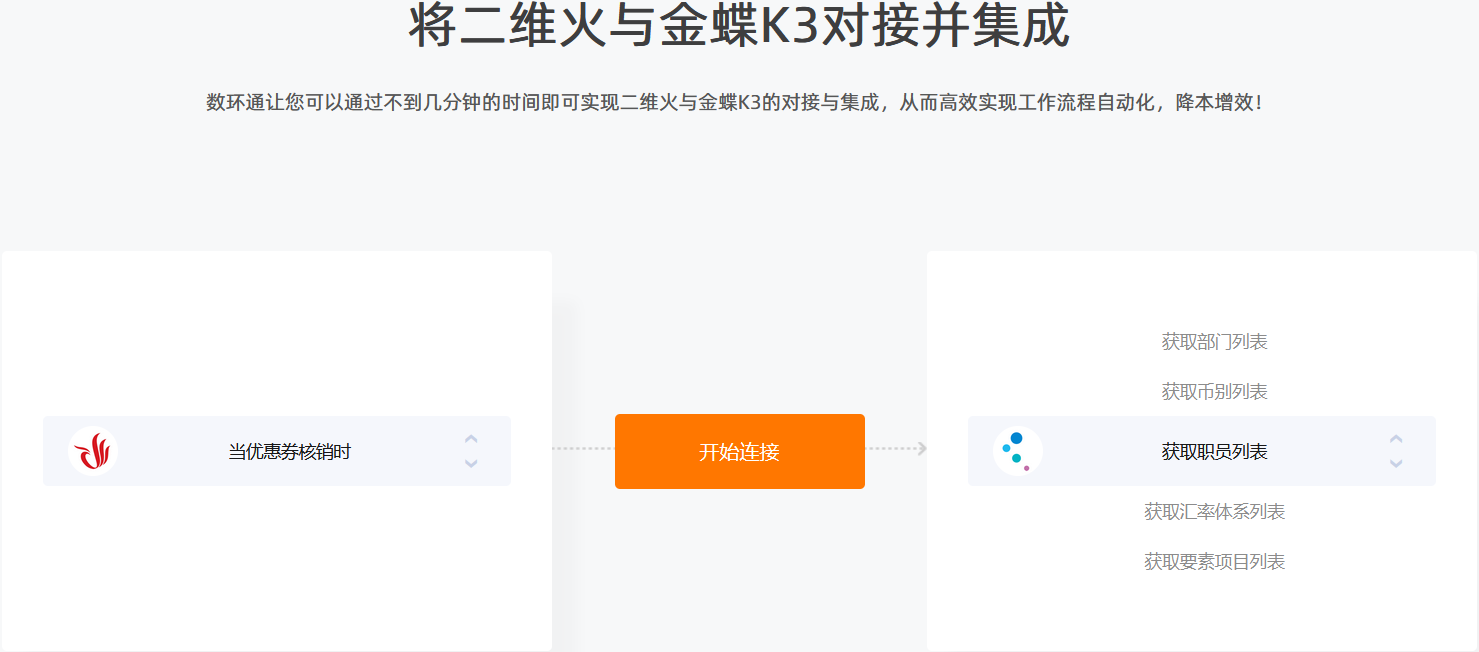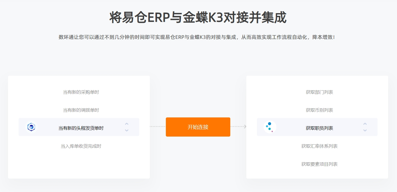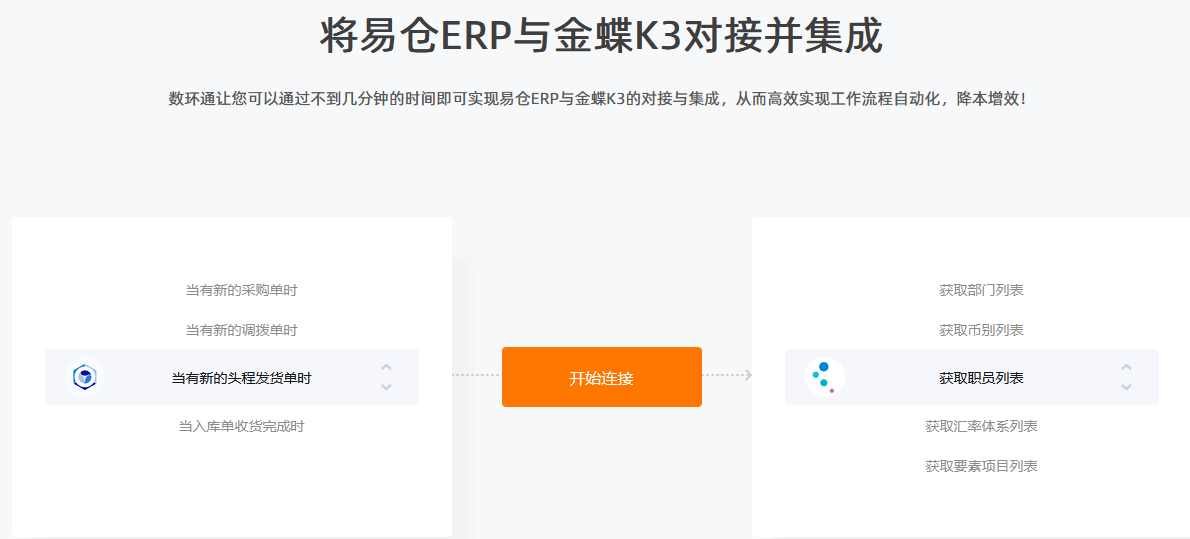 通過數(shù)環(huán)通,您可以使用不到幾分鐘的時(shí)間即可實(shí)現(xiàn)金蝶K3與Teambition企業(yè)的對(duì)接與集成,從而高效實(shí)現(xiàn)工作流程自動(dòng)化,降本增效!