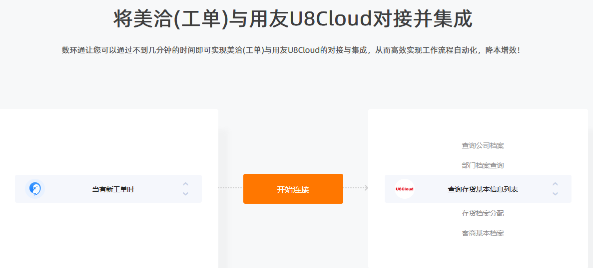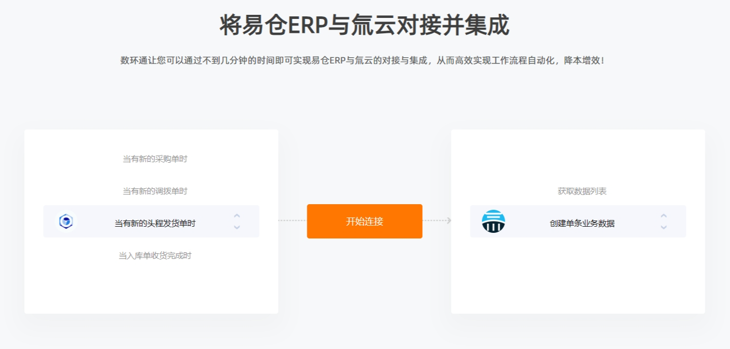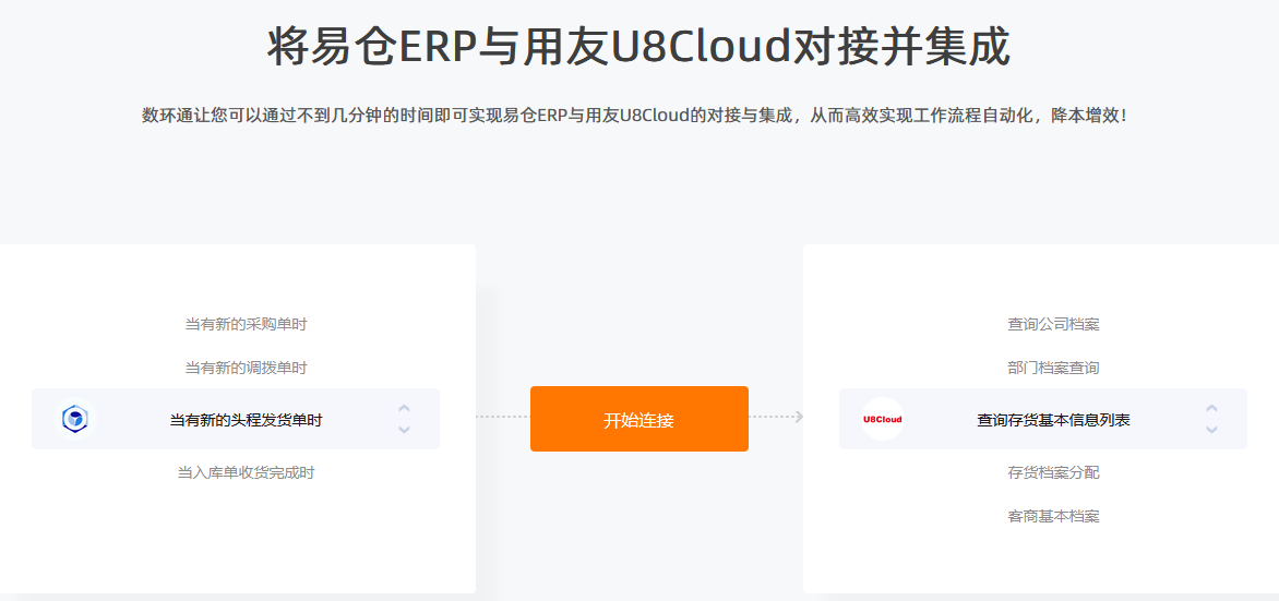 通過(guò)數(shù)環(huán)通,您可以使用不到幾分鐘的時(shí)間即可實(shí)現(xiàn)用友U8Cloud與易倉(cāng)ERP的對(duì)接與集成,從而高效實(shí)現(xiàn)工作流程自動(dòng)化,降本增效!