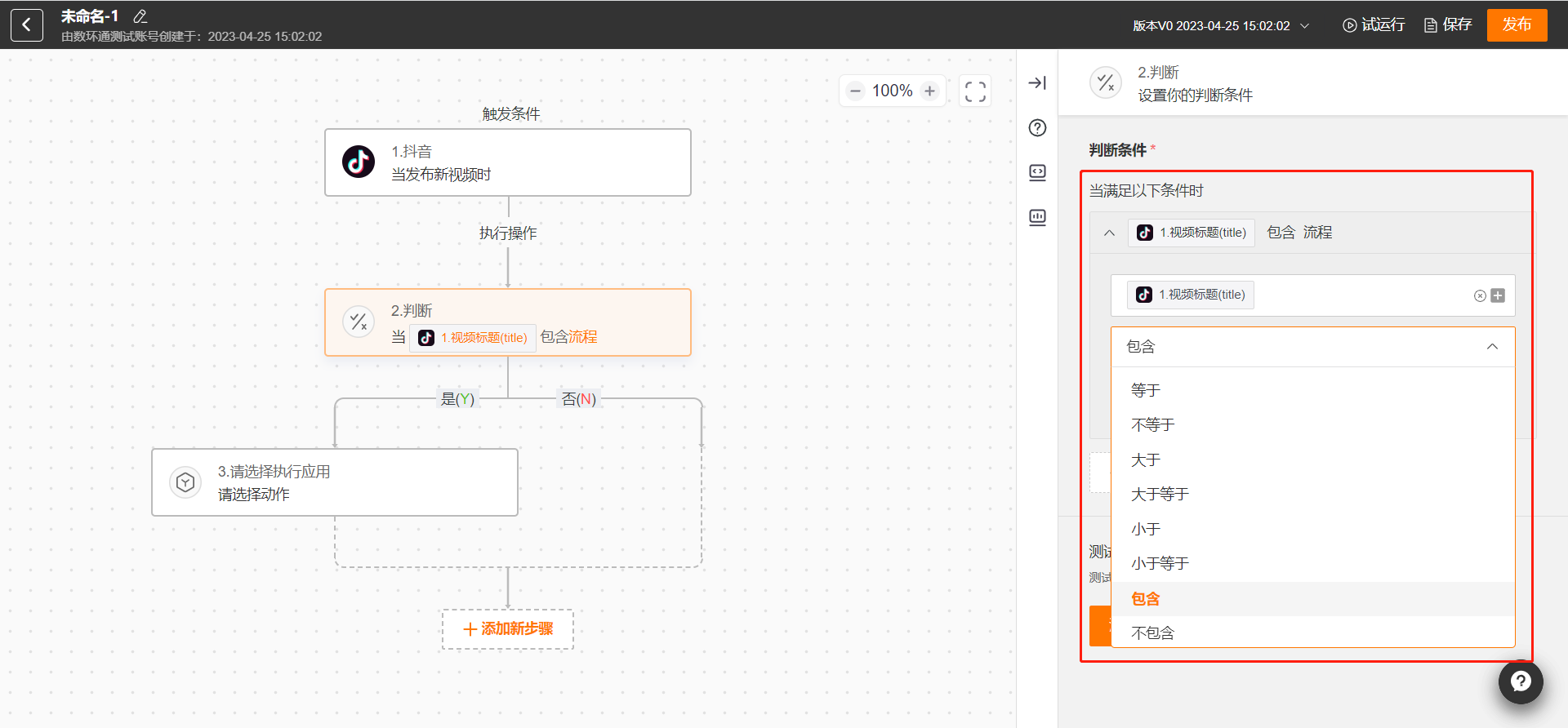 接著設置右側的判斷條件,例如:我希望當新視頻標題里包含“流程”兩個字時,就發通知給指定人員,否則就不發送;