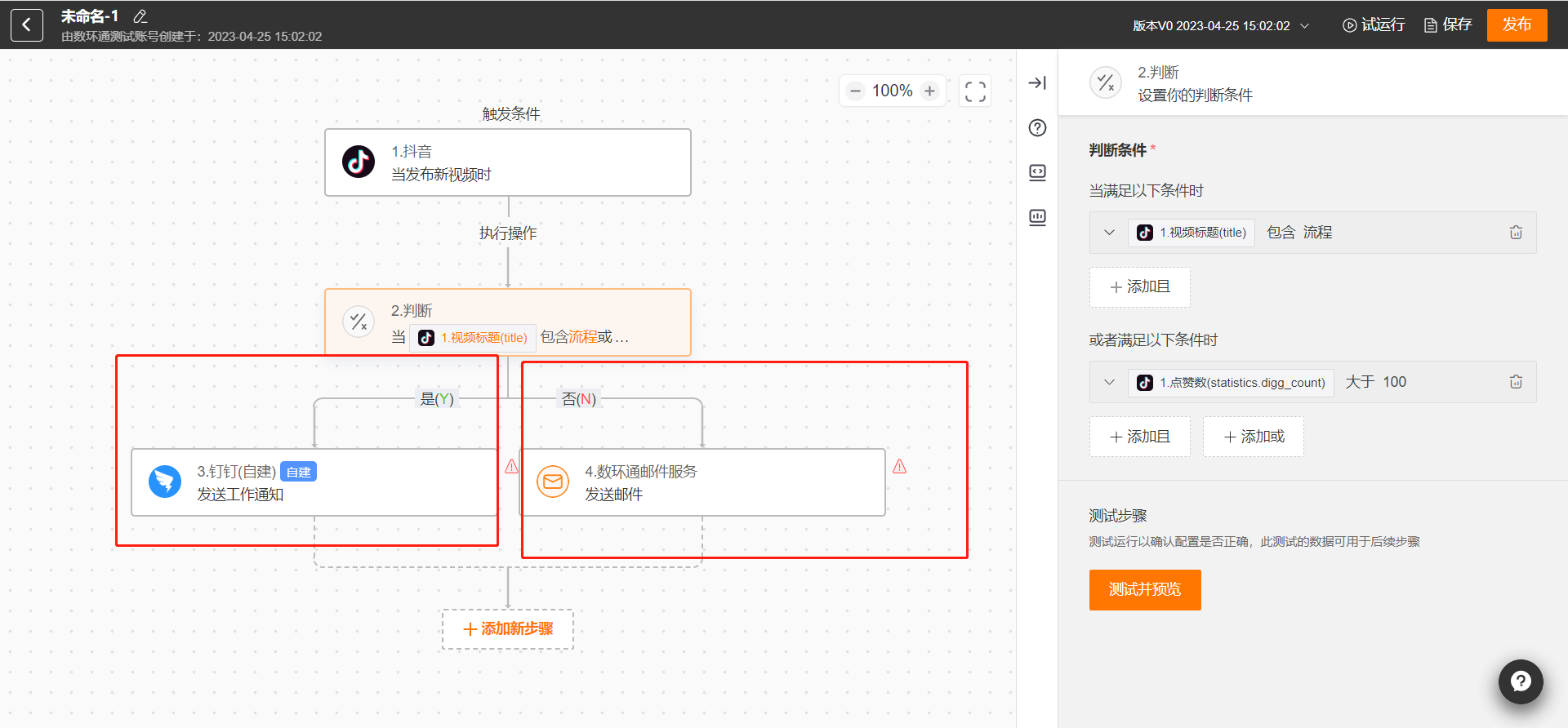 這兩條分支可以根據具體的需求進行選擇,(當條件滿足時,釘釘發送通知給指定人員,不滿足時,發送郵件通知)。