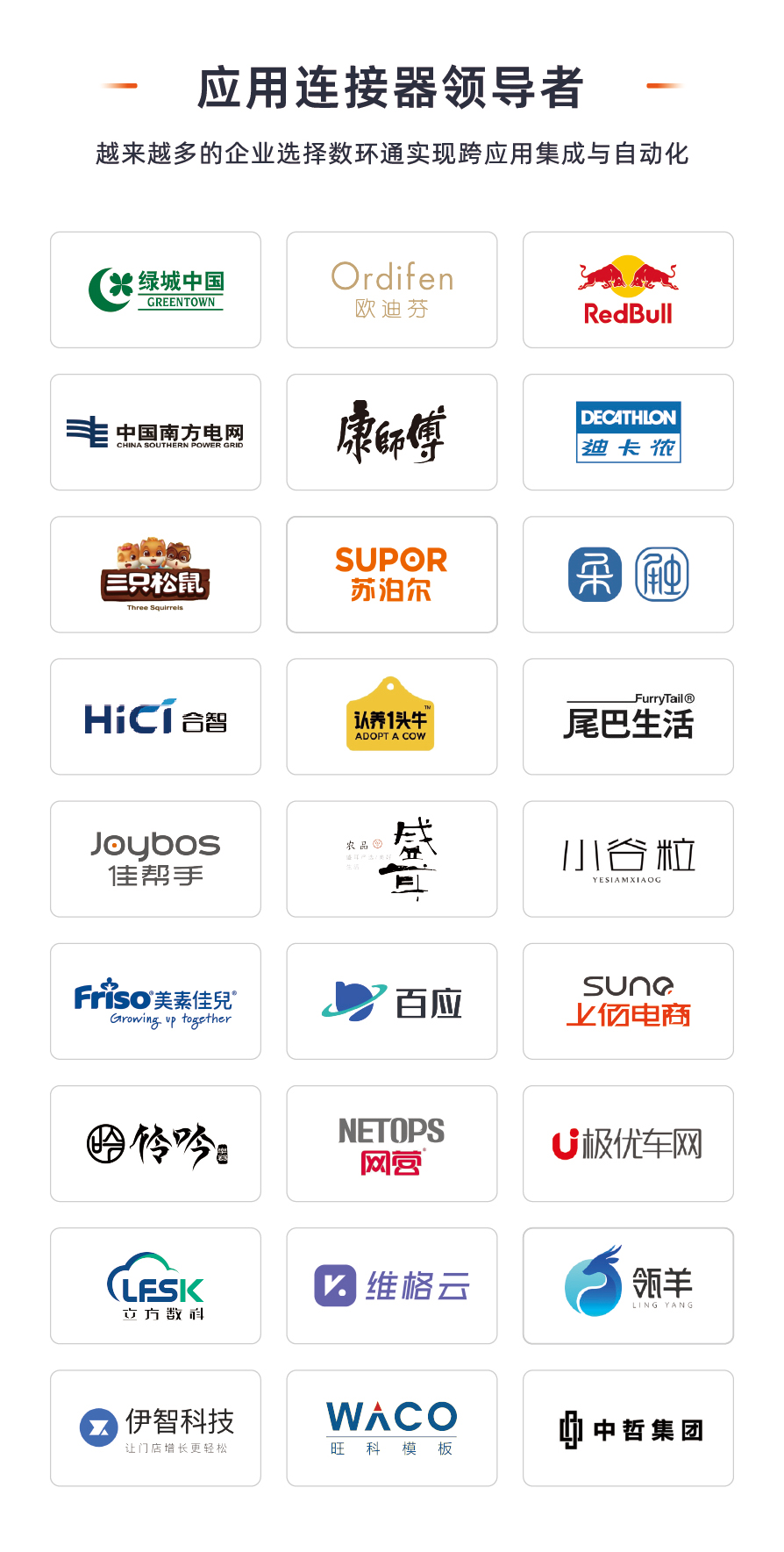 中國南方電網、上佰電商、迪卡儂、認養一頭牛等數千家企業已選擇數環通助力企業數字化經營。