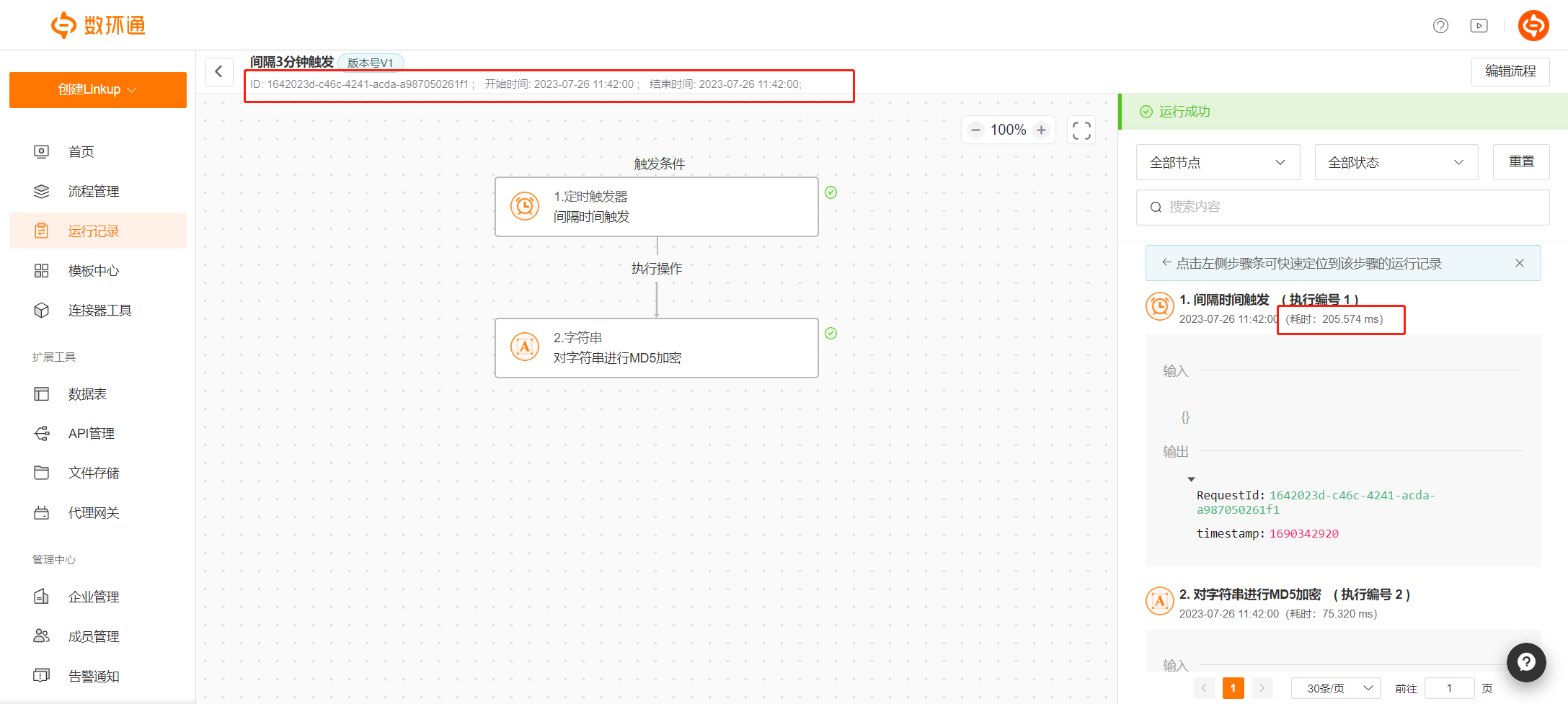 并且,運行記錄詳情增加運行開始時間、結(jié)束時間以及步驟運行耗時,以便更詳細的查閱運行記錄。